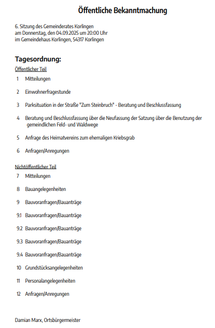 Einladung zur 4. Sitzung des Gemeinderates Korlingen