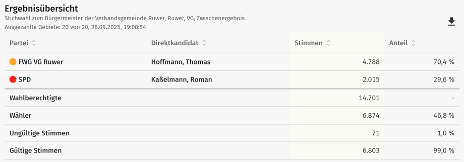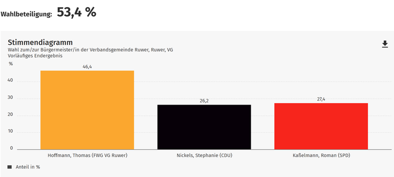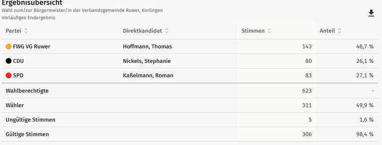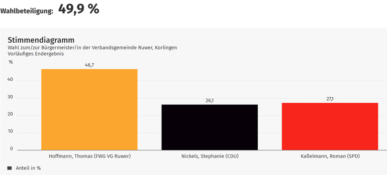 Am 14. September fand die Bürgermeisterwahl in der Verbandsgemeinde Ruwer statt. 3 Kandidaten hatten sich zur Wahl gestellt. Die meisten Stimmen erzielte Thomas Hoffmann (FWG VG Ruwer) mit 46,4 % der Stimmen, den zweiten Platz belegte Roman Kaßelmann (SPD) mit 27,4 % der Stimmen. Den dritten Platz mit 26,2 % der Stimmen belegte Amtsinhaberin Stephanie Nickels (CDU). Ihre Amtszeit endet am 31.12.2025.